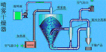 噴霧干燥的原理是向干燥塔內通入溫度較高(130℃~160℃)而相對濕度很低的干空氣,濃奶(或其它液料)經高壓泵的作用霧化成液滴,與熱風接觸而發生熱交換,由于物料經高壓霧化形成無數的霧狀粒子,從而大大增加了表面積,加快了水份蒸發速度,在幾秒內將物料中的水份蒸發。被蒸發的廢氣由排風機排出。廢氣所帶粉塵微粒經布袋過濾室回收,沉降與塔體錐部與塔內顆粒粉體進行混合,由錐體下端出料口卸出塔外,這個過程,即為本設備的噴霧干燥原理。