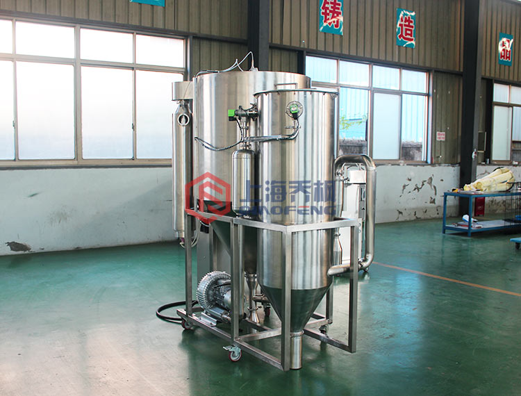 工作過程是料液通過氣動隔膜泵高壓輸入,噴出霧狀液滴,然后同熱空氣并流下降,大部分粉粒由塔底排料口收集,廢氣及其微小粉末經旋風分離器分離,廢氣由抽風機排出,粉末由設在旋風分離器下的收粉筒收集,風機出口處還可裝備二級除塵裝置,回收率在96%-98%。