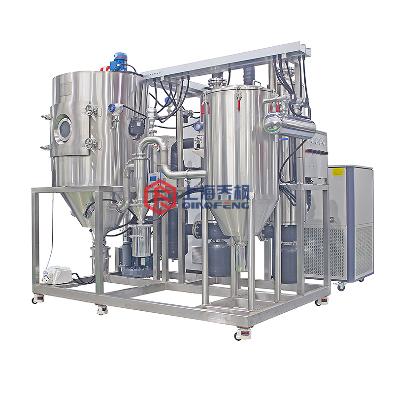 設(shè)備主要由:送料系統(tǒng)、加熱系統(tǒng)、霧化系統(tǒng)、噴霧干燥系統(tǒng)、惰性氣體循環(huán)系統(tǒng)、產(chǎn)品回收系統(tǒng)、冷凝系統(tǒng)組成。